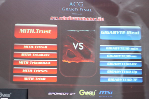 เมื่อสุดสัปดาห์ที่ผ่านมา MiTH.Trust ยอดทีม DOTA2 ของไทยและของทีม MiTH ก็ได้โชว์ผลงานอันสุดยอดต่อสาธารณะชนอีกครั้งด้วยการคว้าแชมป์การแข่งขัน DOTA2 ACG Grand Final Thailand 2012 จัดขึ้นอย่างยิ่งใหญ่ที่ลาน Infinite Hall ชั้น 5 ห้าง Siam Paragon ซึ่งเป็นการคัดเลือกหาตัวแทนประเทศไทยไปเข้าแข่งขัน DOTA 2 The Asia 2012 ที่ประเทศมาเลเซีย ในช่วงวันที่ 21-24 ธันวาคมนี้ครับผม โดย MiTH.Trust ได้สิทธิ์เป็นตัวแทนไปเป็นที่เรียบร้อย ซึ่งงานนี้เป็นงานที่จัดต่อเนื่องจากรายการ SMM 2012 ที่ทีม MiTH.Trust จะบินไปเข้าร่วมตั้งแต่ 12-19 ธันวาคม งานนี้เรียกได้ว่า MiTH.Trust อยู่ยาวที่มาเลเซียเลยครับผมม