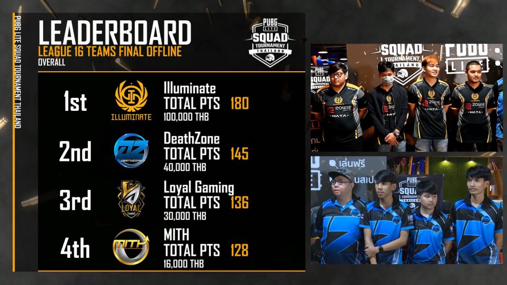 PCZBENZ , OHAYO- , THANATONG- , REALNERROS , TANUAE ผู้เล่นอย่างเป็นทางการเกม PUBGLITE ของทีม MiTH ทำการแข่งขันชิงแชมป์ประเทศไทยในรายการ PUBGLITE Squad Tournament Thailand ซึ่งมีเงินรางวัลรวมหลายแสนบาท ทำการแข่งขันตั้งแต่รอบ Online จนมาจบรอบ LAN ที่ร้าน GSPEED จบที่อันดับ 4 ของรายการ